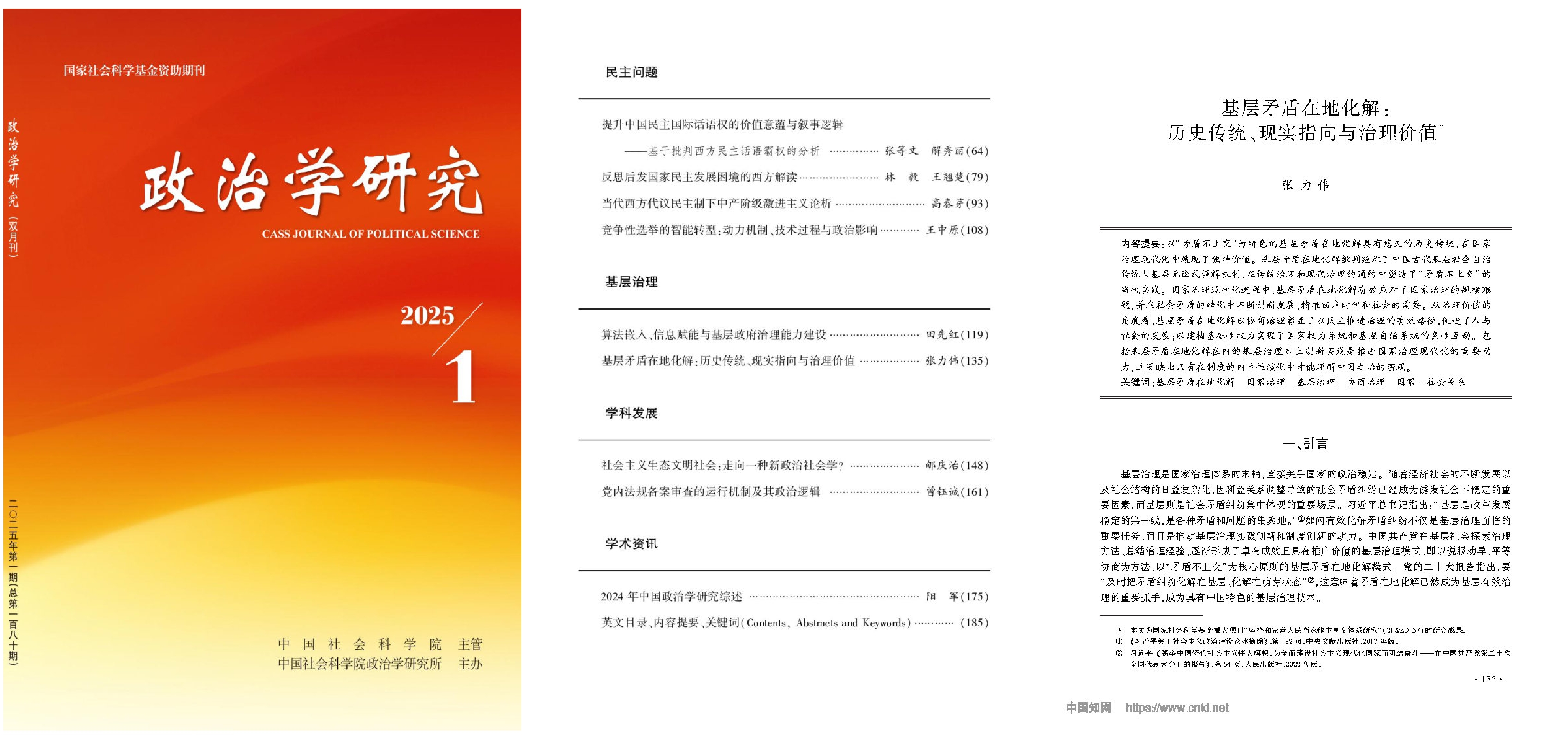 近日,我校P站 张力伟副教授研究成果《基层矛盾在地化解:历史传统、现实指向与治理价值》在《政治学研究》2025年第1期发表。