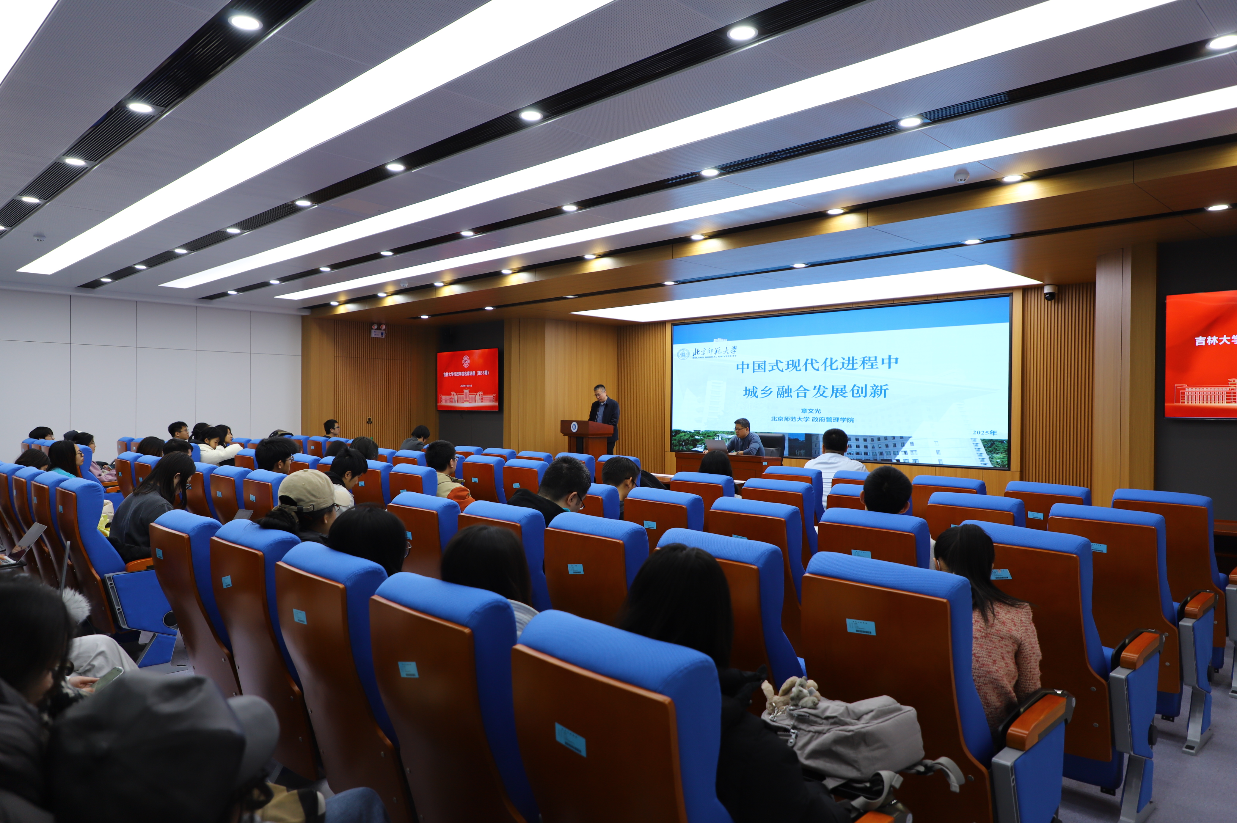 名家讲座(第33期)在东荣大厦B102报告厅举行,北京师范大学二级教授、政府管理学院院长、国家哲学社会科学领军人才章文光受邀担任主讲嘉宾,作题为“中国式现代化进程中城乡融合发展创新”的学术演讲。学院公共管理系董伟玮教授,李慧杰副教授,常成副教授,讲师施响及院内外60余名同学参与讲座。讲座由学院副院长刘雪华教授主持。