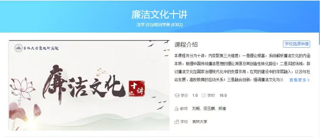 该课程由吉林大学廉政研究院院长刘畅教授、副院长田玉麒副教授和副院长郑倩副教授主讲,课程团队构建起“理论溯源-制度解析-案例实证-文化浸润”四维课程体系,采用“十讲”进阶式专题架构,阐释廉洁文化的理论内涵,挖掘中华传统文化的廉洁基因,解析传统廉洁思想的现代转化,诠释新时代廉洁文化在党的建设、国家治理、社会发展、高校教育、家风建设等多场域中的价值意蕴与实践路径。课程以模块化专题、短课时精讲和多平台互动形式,形成了“理论+实践”“历史+当代”“内化+传播”的特色教学模式,旨在打造兼具学理深度与实践指向的学习体系,助力学生树立廉洁价值观、增强社会责任意识,以培育德法兼修、崇廉尚洁的高素质人才。