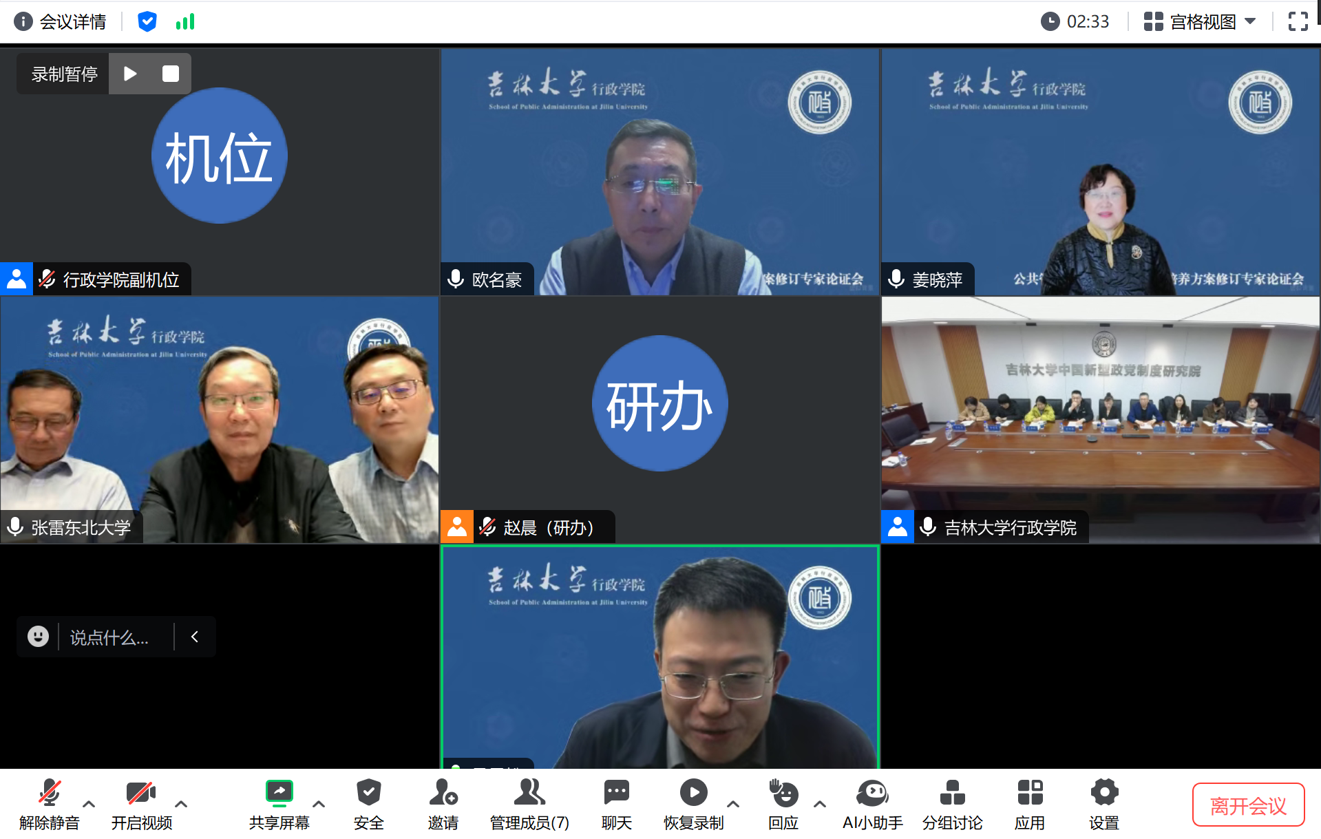 为进一步完善公共管理一级学科研究生培养体系,提升高层次人才培养质量,根据学校相关工作部署,2025年4月14日,吉林大学公共管理学一级学科研究生培养方案修订专家论证会在中心校区东荣大厦A307和腾讯会议线上会议室同步举行。本次论证会邀请到国务院学位委员会公共管理学学科评议组联合召集人武汉大学丁煌教授、国务院学位委员会公共管理学学科评议组成员南京农业大学欧名豪教授、国务院学位委员会公共管理学学科评议组成员四川大学姜晓萍教授、国务院学位委员会公共管理学学科评议组成员西安交通大学李树茁教授、国务院学位委员会公共管理学学科评议组成员东北大学张雷教授。吉林大学P站