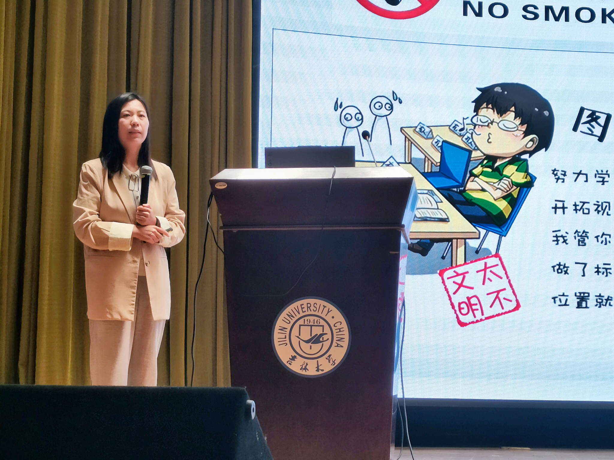 王丽丽主要围绕着图书馆的基本概况、馆藏资源、特色服务、文明公约四方面内容展开。首先,王丽丽向大家介绍了吉林大学图书馆的基本概况,包括馆藏资源分布、图书馆及阅览室开放时间、校园一卡通的借书功能、官方网站及公众号等。接着,王丽丽为同学们分别展示了纸本图书资源和数字图书资源的查找方式与借阅规则,生动演示了如何通过图书馆网站查找期刊论文、检索专业数据库,也为新生详细列举了未来科研过程中可能会用到的互联网公共数据库、吉林大学专属AI数据库等。最后,王丽丽为大家讲解了吉林大学图书馆的相关特色服务,如世界读书日活动、AI技能培训等,以及进入图书馆应当遵守的文明公约。
