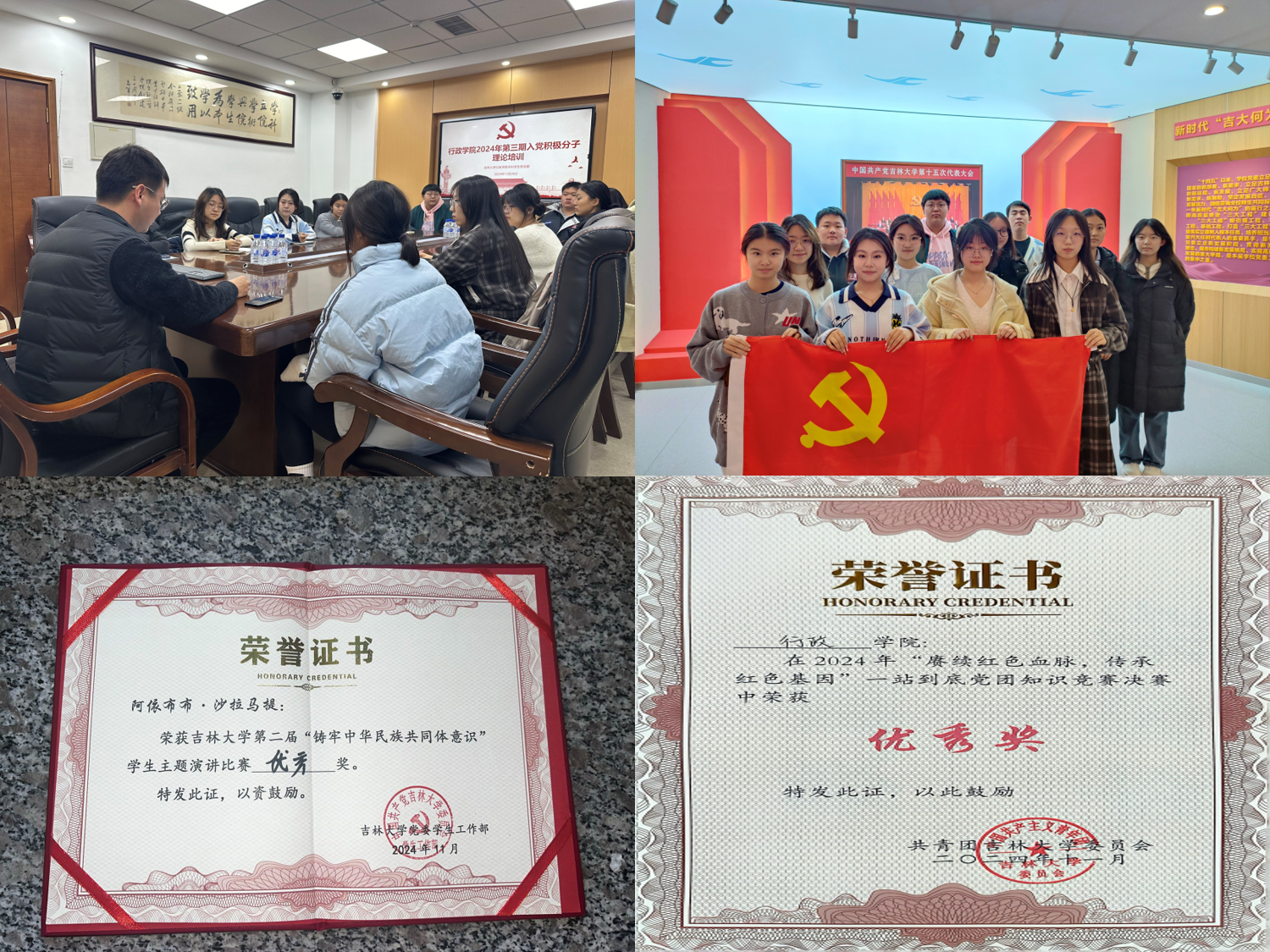 11月1日,本科学生党支部召开党员大会。会议严格落实第一议题制度,持续加强党支部政治建设,提高支部党员的政治站位和政治能力。会议讨论了8名同志入党和2名预备党员按期转正问题。学院党委副书记兼副院长、纪委书记张洁以普通党员身份参加双重组织生活,并对支部建设和党员培养提出了意见和建议。11月16日,硕士第三党支部开展“追寻先贤足迹,传承红色基因”主题党日活动,参观吉林大学历史名人纪念馆,汲取“北上精神”力量,深刻体会先贤艰苦创业精神。11月25至26日,学院组织2024级入党积极分子听党课、悟原理,学习党的二十届三中全会精神,参观校史馆,回眸吉林大学砥砺前行七十余年的风雨历程,感悟青春向北、吉人天下的大学精神。在2024年“赓续红色血脉,传承红色基因”一站到底党团知识竞赛决赛中,2024级本科生杨雅儒、闫春玲、赵芊韵代表学院荣获优秀奖;2024级本科生阿依布布·沙拉马提在吉林大学第二届“铸牢中华民族共同体意识”学生主题演讲比赛中荣获优秀奖。