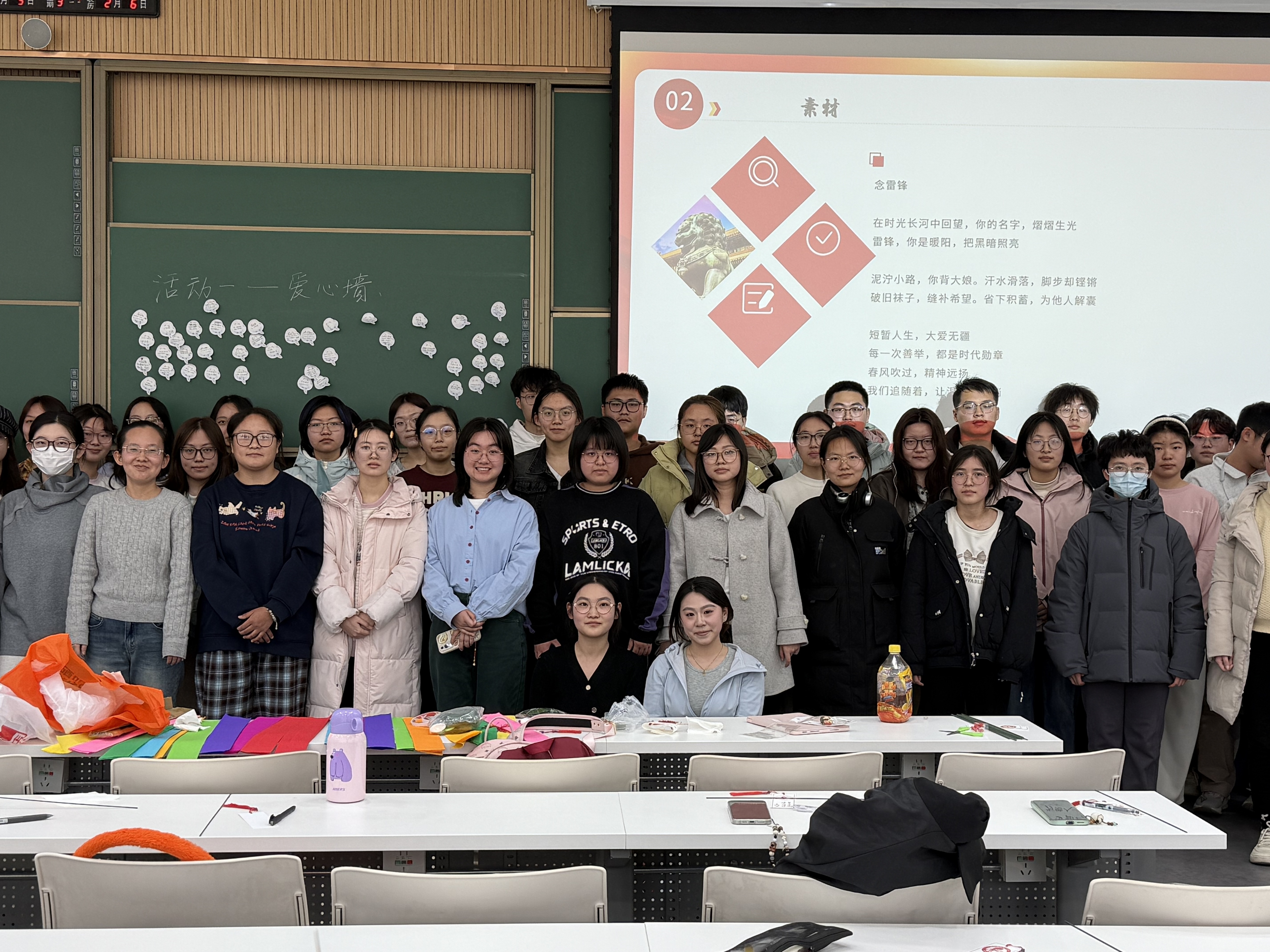 082402、082405班团支部以“学雷锋 树新风”为主题,在法学楼305教室举办团日活动,旨在通过深入学习和实践,弘扬雷锋精神,增强同学们的集体荣誉感和社会责任感,激励大家以实际行动践行雷锋精神,争做新时代的好青年。第一环节,2024级本科生唐若菲带领大家回顾雷锋同志的生平事迹,重点讲述了雷锋同志在苦难中成长、在平凡岗位上无私奉献的感人故事。第二环节,同学们在教室的黑板上制作了一面“爱心传递墙”,用便利贴写下了自己的“微心愿”和“爱心寄语”,表达了对雷锋精神的理解和对身边默默奉献的劳动者的感激之情。第三环节,付诸实践。同学们将制作好的纪念品送给身边默默付出的人,如食堂的叔叔阿姨、校门口的保安、宿管阿姨等。同时,同学们纷纷响应活动号召,在图书馆当志愿者,扶被风吹倒的自行车,在实践中得到了成长和提升。