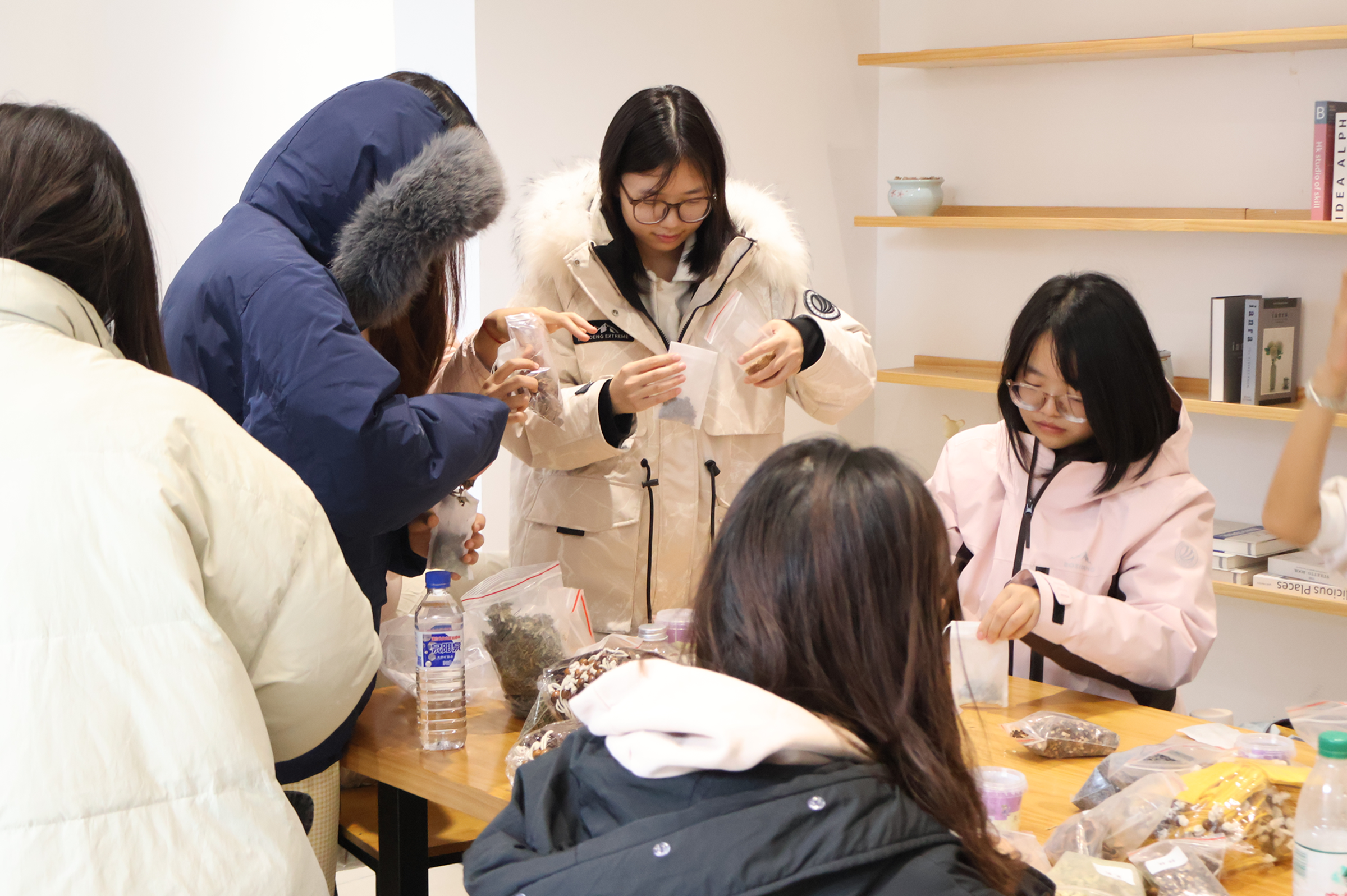 活动当日,现场布置典雅,节日氛围温馨而庄重。在志愿者的有序引导下,同学们纷纷投入到富有传统文化韵味的体验环节中。香囊制作区内,大家仔细挑选艾草、桂枝等香料,亲手制作充满祝福的香囊,现场药香清雅,笑语盈盈。在一旁的菊花种植区,同学们将一份份象征着高洁与长寿的秋色定格在盆器中,体会“采菊东篱下”的诗意与传承。重阳主题背景板前,同学们与挚友同窗并肩而立,在摄影志愿者的镜头下绽放笑容,定格下一张张充满团聚合谊的温暖瞬间。整个流程衔接顺畅,秩序井然,志愿者们耐心协助,确保了每一项体验都充满获得感与仪式感。