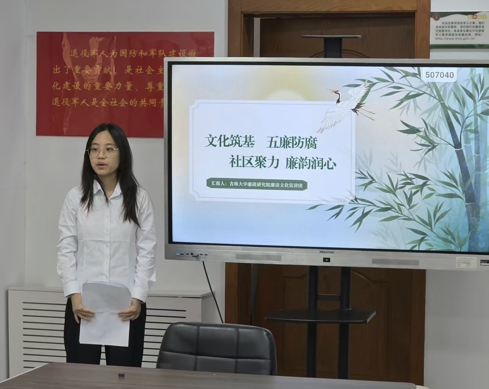随后,宣讲团成员、2024级研究生王琪主讲廉洁文化,以《文化筑基,五廉防腐;社区聚力,廉韵润心》为题,系统讲解了吉林大学廉政文化以及廉洁文化建设提炼出的经验及启示,并援引长春市朝阳区廉洁文化建设的典型事例,阐释了廉洁的价值理念,强调廉洁文化建设对社区工作人员的重要意义,引导大家将廉洁自律内化于心、外化于行。