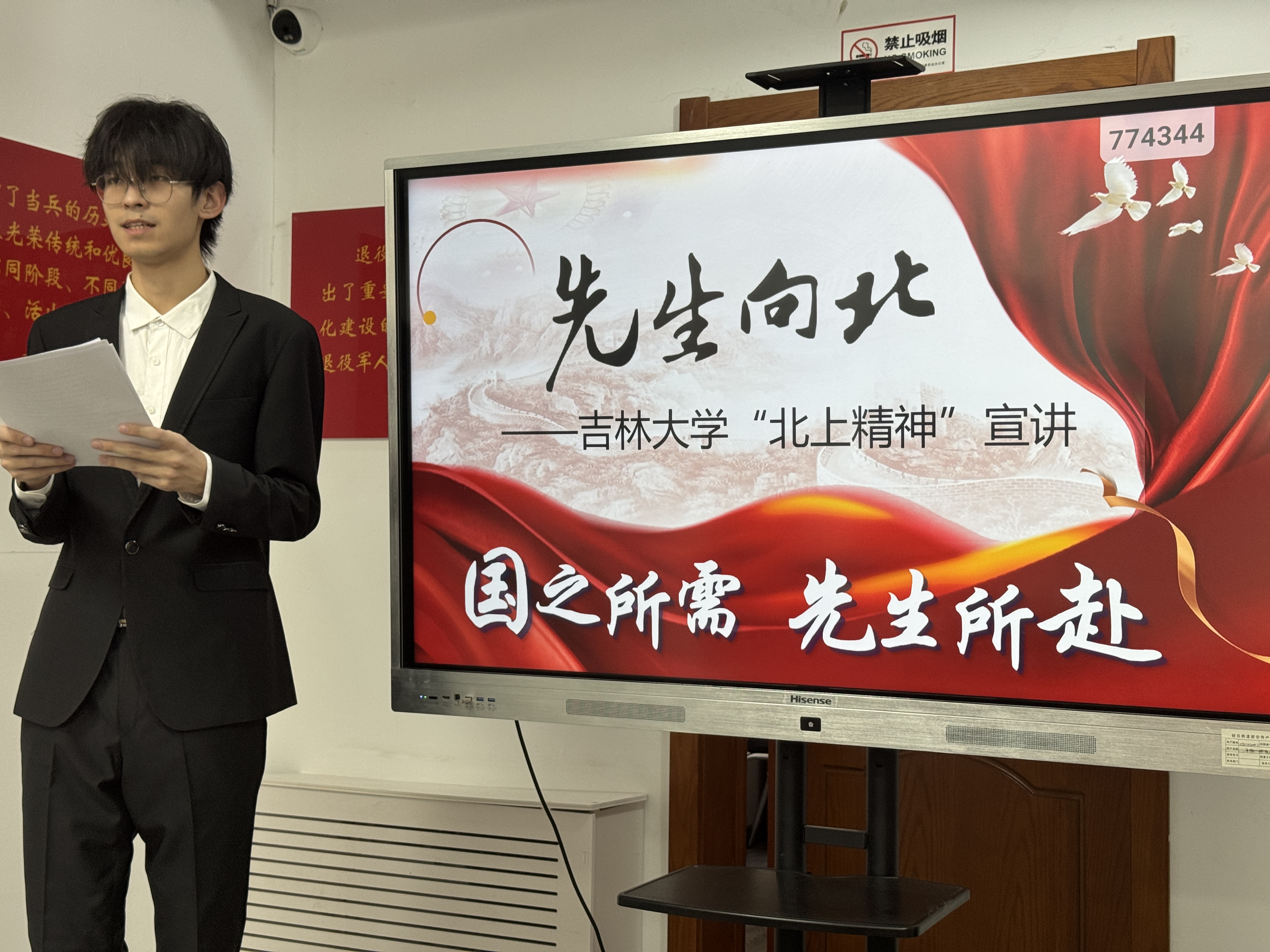 宣讲现场,宣讲团成员、2024级行政管理本科生徐赫健以《在白山黑水间赓续东北抗联精神》为题开展宣讲,系统讲述以“坚定的革命信念、高尚的爱国情操、伟大的牺牲精神”为核心的东北抗联精神,回顾东北抗联将士在极端艰苦条件下坚守阵地、奋勇抗敌的英雄史诗。同时,结合吉林大学的历史系统解读“听党号召、至诚报国、扎根东北、艰苦奋斗”的北上精神,通过历史场景再现与时代价值阐释相结合的方式,让社区工作者深刻感悟红色精神跨越时空的强大生命力。