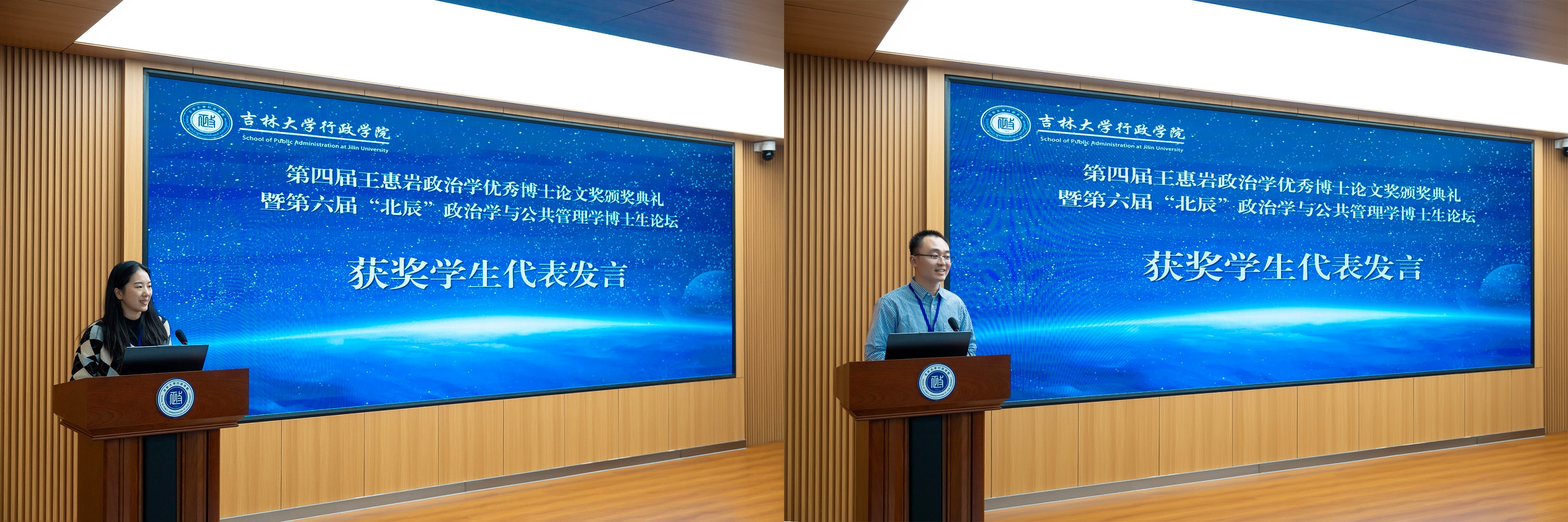 论坛评审委员会坚持公平、公正、匿名评审的原则,评选出8篇获奖论文,史慕华宣读第六届“北辰”政治学与公共管理学博士生论坛获奖名单。吉林大学张迪、浙江工商大学冯显莺获得一等奖;东北大学王泽、吉林大学王鼎量、吉林大学兰成东、华东政法大学左澜涛、吉林大学卢衍航、吉林大学余晓霞获得二等奖,随后颁奖嘉宾为获奖学生颁奖。张迪、冯显莺作为学生代表发表获奖感言。