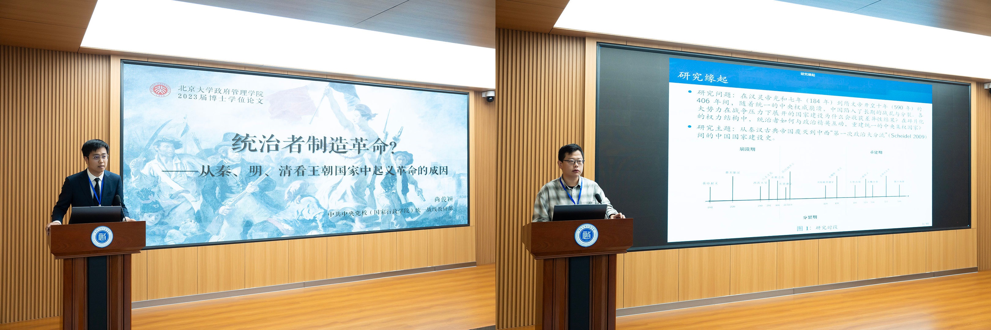 第四届王惠岩政治学优秀博士论文优秀奖获奖者尚俊颖、杨端程分别进行论文展示。尚俊颖就其博士论文《统治者制造革命——从秦、明、清看王朝国家中起义革命的成因》展开分享,表示避免革命的关键在于避免统治者犯下不可逆转的战略性错误,他对革命是到来的还是制造的这一问题从行动者的角度给出回应,并指出整合性的叙事策略能够为比较历史政治学或者比较历史政治分析提供一种相对完备的分析框架。杨端程就其博士论文《中国国家的衰落与兴起(184年-590年)——统治者、精英与国家建设的历史分析》展开分享,他结合史料和社会科学方法,探索历史变迁中的普遍性结构和机制,超越“欧洲民族主义”的研究视角,为理解国家建设提供历史借鉴。