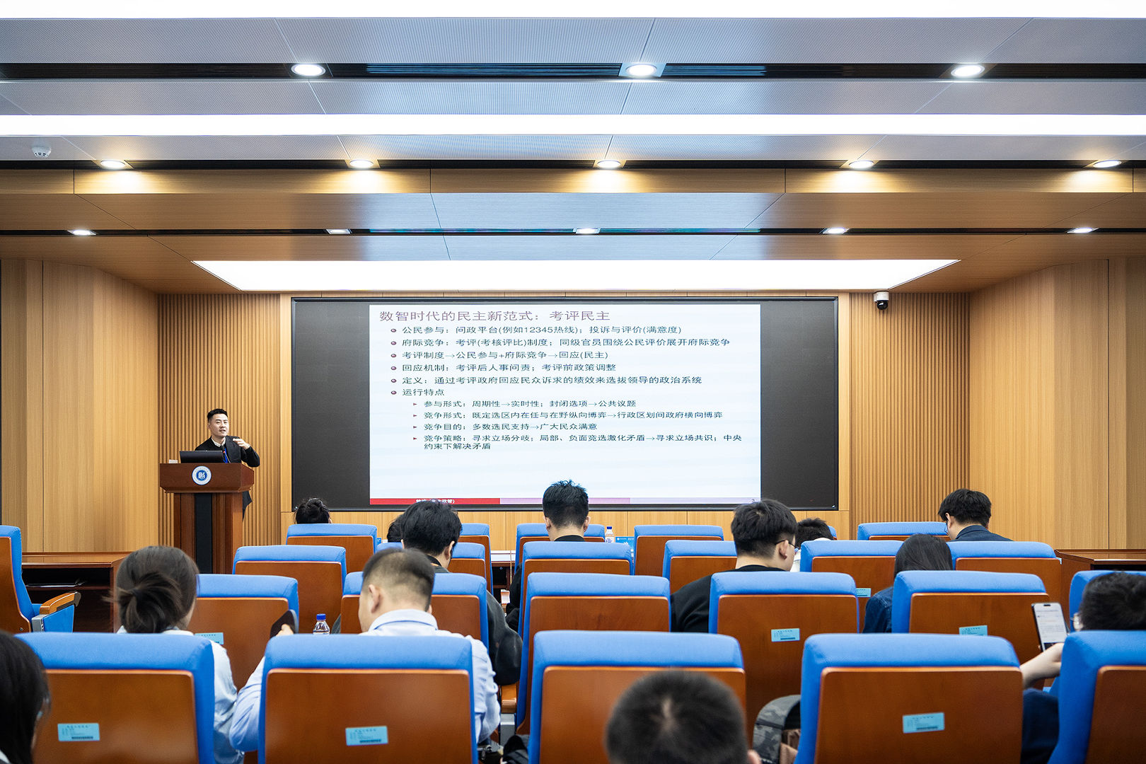 第二场报告主讲嘉宾为北京大学政府管理学院助理教授、研究员、博士生导师曾渝。曾渝老师以《考评民主:以府际竞争促政府回应》为题,向大家介绍了考评民主这一数字时代新的民主治理范式。他围绕构建人类命运共同体、推进国家治理现代化的需求,对比选举民主的回应机制与局限,阐释考评民主以公民问政与评价为参与形式、以府际横向竞争为核心,通过考评前后的问责与政策调整实现民意回应的运行逻辑,分析其在党中央领导下避免局部化等制度优势并提出落地路径。该研究为西方民主话语转化、构建中国政治学自主知识体系,回应中国之问、时代之问、人民之问提供了新视角。