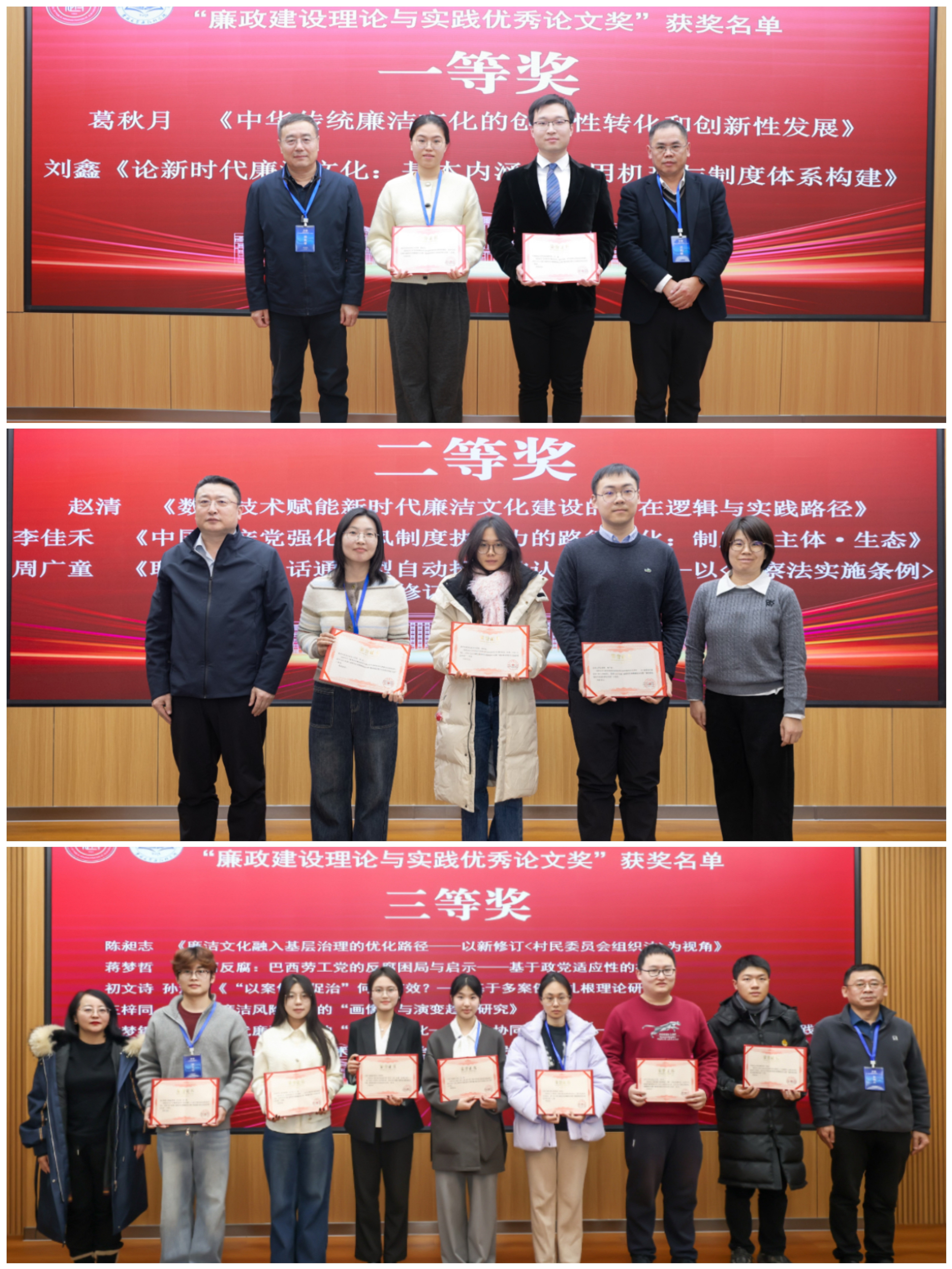 政治学系副主任、廉政研究院副院长田玉麒副教授主持。闭幕式上,首先由研究生清晏廉政论坛第一、二阶段分会场代表分别汇报了研讨成果,系统总结了论坛在数智廉洁治理、跨学科融合、国际比较研究等方面的学术收获。随后,吉林大学廉政研究院副院长郑倩副教授宣布评奖流程与获奖名单。本次评奖严格遵循回避制度与全过程双盲评审制,经过“论文征集 — 自主申报 — 资格审查 — 通讯评审 — 专家会评”等规范流程,最终评选出“廉政建设理论与实践优秀论文奖”11篇,其中一等奖2篇、二等奖3篇、三等奖6篇。袁柏顺教授、柏维春教授,李红权教授、杜晓燕教授、吕红娟负责人、朱明仕教授分别为获奖者颁奖。
